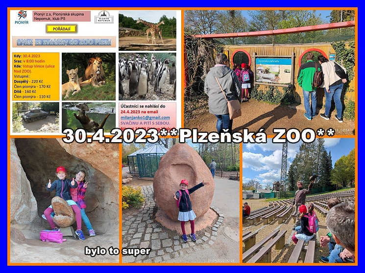 Dne 30. 4. 2023 jsme uspořádali dopolední procházku v plzeňské Zoo. Sraz jsme si dali v 8:00 u horního vstupu do Zoo na Vinicích.Odtud jsme se prošli přes japonskou zahradu, lanové centrum, navštívili jsme rysa, viděli vydru, … Šli jsme ve složení 4 dospělí a 2 děti. Po cestě jsme zodpověděli nějaké dotazy rodičů k táboru, probrali jsme zhruba o čem bude tábor. Vyvrcholení dopolední procházky bylo od 11hodin ukázka sokolnictví. Zhruba ve 12 hodin jsme opustili Zoo. Myslím, že se procházka v Zoo vydařila, děti si užili zvířata různá sportovní hřiště v Zoo, a i dospělým se akce líbila a prý rádi dorazí znovu. **Milan Janko