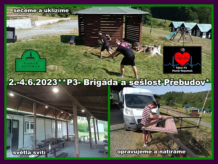 Letní sraz klubu P3 (2.-4.6.2023) byl koncipován především pracovně, aby byla základna připravena na letní sezónu táborů. Během víkendu jsme stihli posekat a shrabat trávu v celém areálu; natřít přístřešek a některé chaty; vyměnit světla ve všech chatách; vyměnit halogeny nad jídelními stoly a změnit elektroinstalaci tak, aby se dalo pohodlně rozsvicovat hned za vchodovými dveřmi; vyměnili jsme poničené baterie a opravili jsme vchodové dvěře od toalet. Sobotní večer jsme trávili tradičními hrami na rozvoj skupinové spolupráce a stihli jsme také poradu k chystánému táboru, kde jsme si rozdělili jednotlivé mýtické postavy a progrmaoví vedoucí nás seznámili s detailním programem, který jsme ještě více rozpracovali.**MilušR
