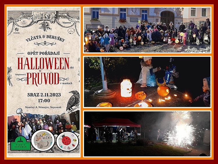 Strašidla obsadila náměstí!!!Velká i malá strašidla se sešla na třetím lampionovém halloveenském průvodu v Nepomuku. Cestou nás čekala tajemná atmosféra s roztodivnou strašidelnou výzdobou, na konci průvodu bylo v parčíku připraveno nejen občerstvení a horké nápoje, ale pro nejmenší děti napekla teta Lenka i sušenky, které dostaly děti za odvahu. Večer děti prozářily prskavkami a nechyběl ani tradiční miniohňostroj. Slyšeli jsme, že už těšíte na příští rok, že jste si na déšť na našich akcích už zvykli a neodradí vás. Co na to říct… Jsme moc rádi a doufáme, že nás v tom nenecháte na dalším setkání – tentokrát se sv. Martinem 11.11.2023. Sejdeme se s ním v 15:00 na náměstí. Tým z Pionýrské skupiny Nepomuk a MC Beruška