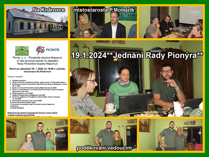 V pátek 19.1.2024 se uskutečnilo jednání Rady Pionýrské skupiny Nepomuk. Na "výročce" se hodnotil se rok 2023, připravovalo se a navrhovalo se zaměření činnosti pro letošní rok. Nejvíce se hovořilo o táborové činnosti. Jednání byl přítomen i místostarosta města P. Motejzík, který kladně hodnotil naši činnost. Dárečky s poděkováním obdrželi vedoucí oddílu a táborníci.