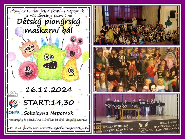 Dětský maškarní bál plný radosti a úsměvu proběhl v sobotu 16.11. 2024. Veselá hudba, pestrobarevné kostýmy a smích dětí naplnil sál Sokolovny. Princezny, superhrdinové, berušky, hasiči… zaplavily parket. Nechyběl tam ani policista, doktor a zdravotní sestřička…. Děti se s nadšením účastnily různých soutěží. Vrcholem odpoledne byla velká tombola. Každé dítě si odneslo malou výhru, což rozzářilo oči i těm nejmenším. Doprovodný program bral dech jak dětem tak rodičům, vystoupil hudební sbor Umělecké školy Nepomuk s písněmi z Ledového království a jiných dětských filmů. Velice děkujeme za obrovský zážitek. Bylo těžké vybrat nejlepší kostým, každý byl jedinečný, a tak nejkrásnější byl každý. Na památku si každý odnesl malou cenu a pamětní list. Už teď se všichni těší na další ročník, který přinese nové zážitky.**KŠ