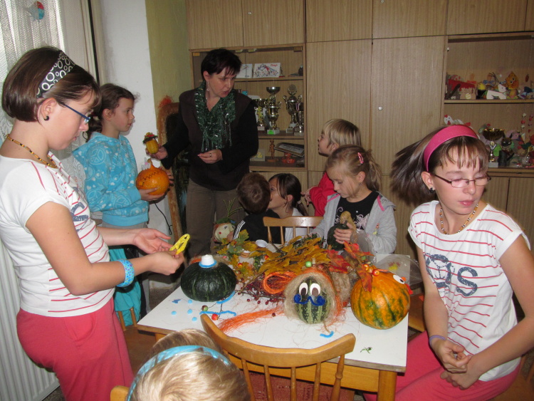 Letos prý dýně nenarostly. Na našem dýnňování ve středu 23.10.2013 jich bylo určitě dost a každý si mohl vybrat. Ty velké jsme dlabali a ty menší dýně jsme jenom přizdobili. Děti z oddílu Pusík a Knoflici vytvořily nádhernou sbírku pro naši výstavku. Vytvořené dýně a dýničky jsme vystavili od 26.-31.10.2013 v parčíku před naší klubovnou. K dýním za chviličku přilétly naše čarodějnice z pohádkové půdy. Povedla se nám opět moc hezká výstavka. Byla hezká i večer při rozsvícených svíčkách. Podívejte se na fotografie i prezentaci.