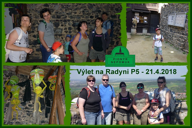 V sobotu 21.4.2018 uspořádala pionýrská skupina P5, při pionýrské skupině Nepomuk výlet na hrad Radyně.Na akci dorazilo deset účastníků. V sobotu ráno jsme se sešli v 10:00 hodin na konečné tramvaje číslo jedna na Slovanech v Plzni. Z konečné tramvaje jsme odjeli trolejbusem číslo 13 do Černic k nákupnímu centru. Nešli jsme nakupovat. Odtud jsme vyrazili pěšky na hrad Radyni. Během cesty jsme udělali jednu pauzu na občerstvení, jelikož s námi byli chlapci, kteří jsou ve vývinu. Ve 12:10 jsme dorazili do cíle. Před námi se tyčí hrad Radyně a my jdeme na prohlídku. V podhradí probíhali slavnosti vína. Po prohlídce jsme se posilnili a odpočinuli na zpáteční cestu. Ve 14:00 hodin jsme vyrazili zpět. Naše putování skončilo v 16:00 hodin na konečné tramvaje na Slovanech.Akce se povedla i počasí nám přálo.*Miroslav Hejlík