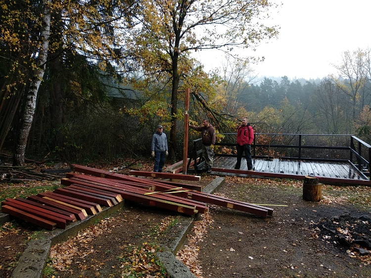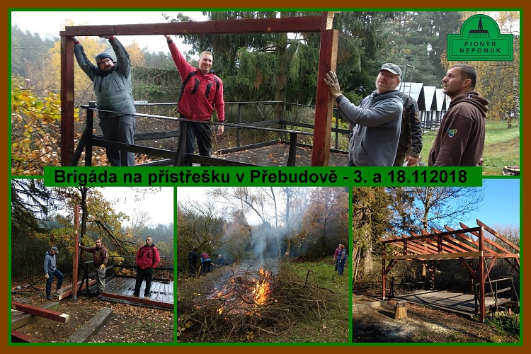Stavení přístřešku na Přebudově 2.11. a 18.11.20108.Na posledním vedení v říjnu jsme se domluvil na termín, který by všem přítomným vyhovoval a s tímto termínem byl osloven truhlář. Nakonec počasí přálo, ikdyž ráno trochu pršelo, ale nás to neodradilo a my se sešli a udělali, co je v našich silách. Jelikož jsme potřebovali dva delší trámy, tak jsme byli nuceni domluvit další termín na dodělání a tím byla neděle 18.11.2018. Ještě se stačilo prořezat nějaké roští při spodní hranici tábora. Sraz 18.11.2018 byl poznamenám mrazíkem, bylo trochu chladno, ale sluníčko se nás přes dopoledne pokoušelo zahřát. Přístřech už je téměř hotový. S mistrem truhlářským se dělá jedna radost. Už zbývá dodělat jen střechu. :-)*VH