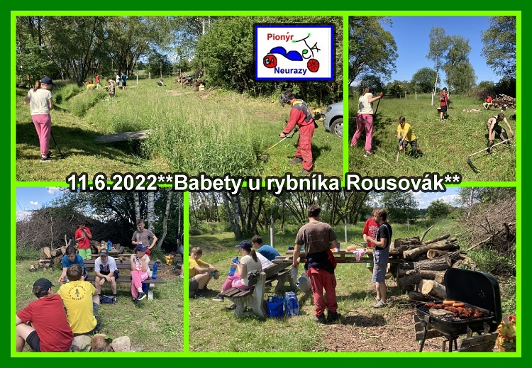 Babety se stále starají o okolí rybníka Rousovák v Neurazech - 11.6.2022. U vody roste tráva jako z vody . Opět nás čekala velká dřina při sekání vysoké trávy a odvoz na určené místo, úklid hromad země z čištění břehů. Došlo i na vlastní čištění rybníka od větví a spousty napadaného listí. Po práci nás čekal ohýnek a buřty. Krásná akce prospěšná na všem, ale hlavně přírodě. **MS