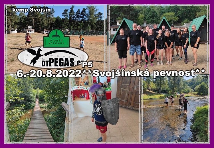I letošní dětský tábor jsme absolvovali na základně pana Krause, v malebném údolí řeky Mže, u obce Svojšín a to v termínu od 6.8. do 20.8.2022.Táborem nás provázela celotáborová hra Pevnost Svojšín. Pro děti byly nachystány nejrůznější soutěže, které prověřily jejich týmového ducha, ale také schopnosti jednotlivců. Děti prolézaly provazovým bludištěm, unikaly ze sklepení, šifry je potrápily při hře Nápisy Pánů ze Svojšína, paměť prověřily při cestě paměťovým bludištěm, stavěly věž ze špaget, procházku po okolí táborové základny si užily při hře Člověče, nezlob se v přírodě, či hledaly zločince, kteří unikli z pevnosti Svojšín. Za zmínku stojí také celodenní výlet na zámek ve Svojšíně. Pro děti byla připravena prohlídka zámku a zahrady. Některé děti si také vyzkoušely dobové kostýmy, ve kterých absolvovaly i zámeckou prohlídku. Při zpáteční cestě ještě v lese postavily domečky z přírodnin a pak už hurá do tábora. Nezapomněli jsme ani na tvoření, kdy děti vyráběly klíče, pavoučky, myšky a další výrobky ze samo tvrdnoucí hmoty či vlny. Večery jsme trávili zpíváním při karaoke, tancováním, opékáním buřtů a zpíváním u táboráku a dalšími hrami a soutěžemi. CTH byla rozdělena na tři části. V první části děti za vyhrané soutěže, hry a další aktivity získávaly klíče od pevnosti, poté podstupovaly duely o čas v pokladnici s Pány Svojšína a nakonec získávaly indicie pro sestavení hesla k pokladu. K pokladnici se dostaly všechny oddíly a nikdo tedy nebyl ochuzen o sbírání zlatých Svojšínků. Jeden z oddílů si ale hned od začátku vybojoval náskok, který udržel i v samotném závěru a vyhrál celotáborovou hru. Byl to oddíl modrých „Synů Fury“. Tábor končí, jak jinak než závěrečnou diskotékou. Každé dítě z tábora odjíždělo s pamětním listem a CD s fotkami. I příští rok vyrazíme do Svojšína za dalším dobrodružstvím. **M. Hejlík