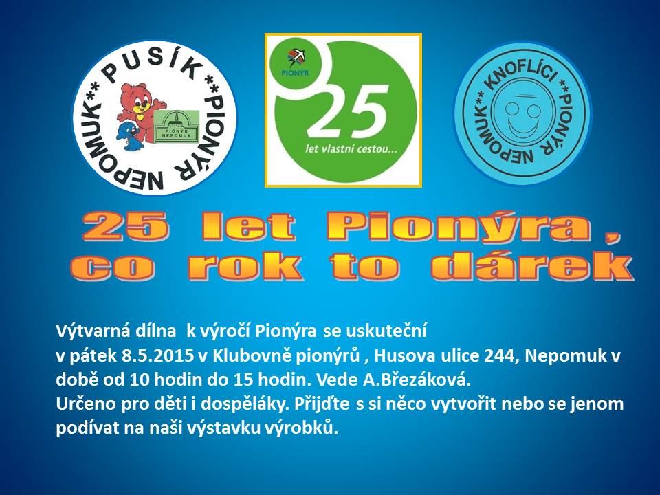 Naše dětská organizace Pionýr připravuje a organizuje volný čas dětem a dospělákům v malém městečku jižně od Plzně.