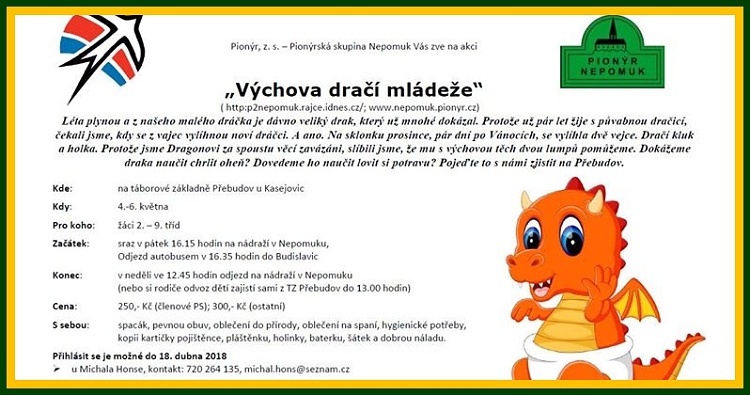 Pionýrská skupina Nepomuk připravila pro léto 2025 šest táborových běhů, tábor rodičů s dětmi a tři příměstské tábory.. O přihlášky na tábory si můžete napsat nebo zavolat na kontakty uvedené v letáčku. img