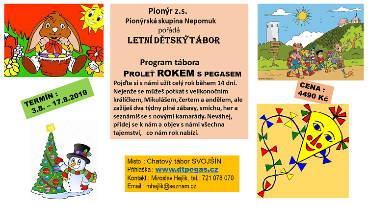 Pionýrská skupina Nepomuk připravila pro léto 2025 šest táborových běhů, tábor rodičů s dětmi a tři příměstské tábory.. O přihlášky na tábory si můžete napsat nebo zavolat na kontakty uvedené v letáčku. img
